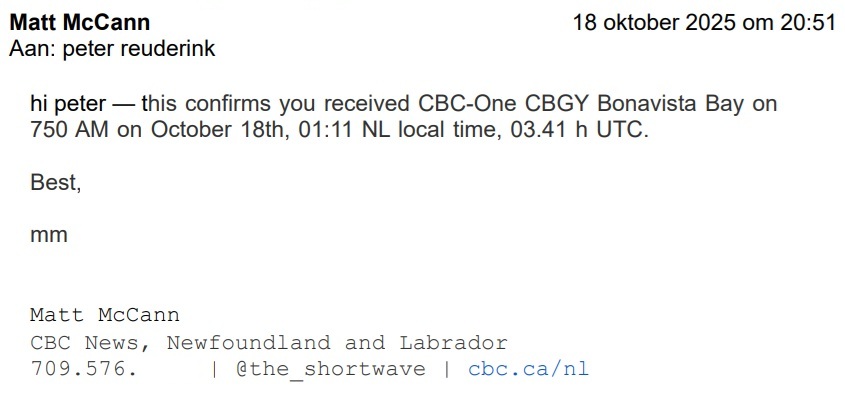 A QSL from CBC Bonavista Bay, Newfoundland, Canada on 750 kHz. I struggled to hear them earlier due to the presence of nearby MCB from Alphen aan de Rijn on 747 kHz. But now that one has move to 846 kHz I can hear CBC regularly.