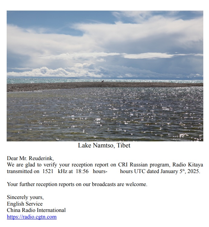 On the audioclip below you can hear the familiar CRI tune, followed by a Chinese and Russian ID: “Govorit Mezhdunarodnoye Radio Kitaya (This is China Radio International speaking)”. I sent my report to crieng@cri.com.cn. After a recent reminder I received the e-QSL