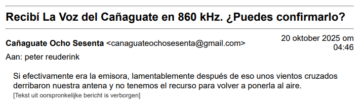 During my stay on the island of Curacao, March 2024, I received La Voz del Canaguate from Valledupar on 860 kHz. In excellent quality, no surprise given the distance. Of course I sent them a reception report, but I heard nothing… until last week, one and a half year later…