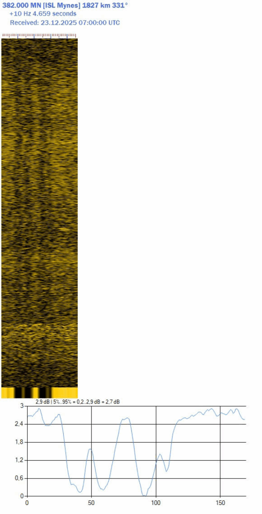 I was really pleased with the reception of NDB MN Mynes at 382 kHz, as it is definitely one of the Icelandic NDBs that is more difficult to receive in The Netherlands. On the Pskov recording below their signal can be seen, It is a bit different from other Icelandic beacons as they use a negatively keyed carrier.