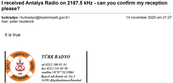 As far as I know there are 4 stations active on DSC watch 2187.5 kHz from Turkey. Earlier I received replies from Istanbul Radio, Samsun Radio and Izmir Radio. So when I received a test confirmation from Antalya Türk Radio on a test message of tanker ADRIA in the eastern Mediterranean I hoped to put a “crown” on my Türk Radio QSL collection.