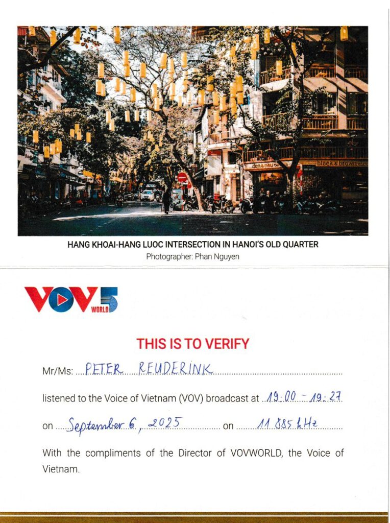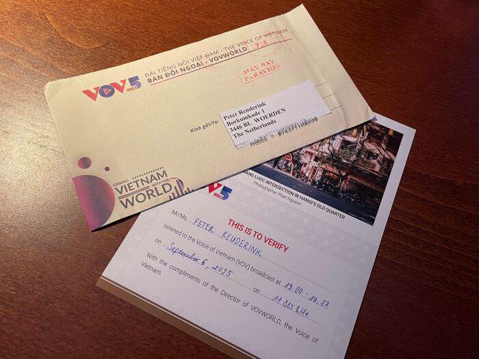 Earlier I wrote about the 80th anniversary of the Voice of Vietnam. My reception report to englishsection@vov.vn was awarded with a beautiful traditional QSL in a nice envelope: